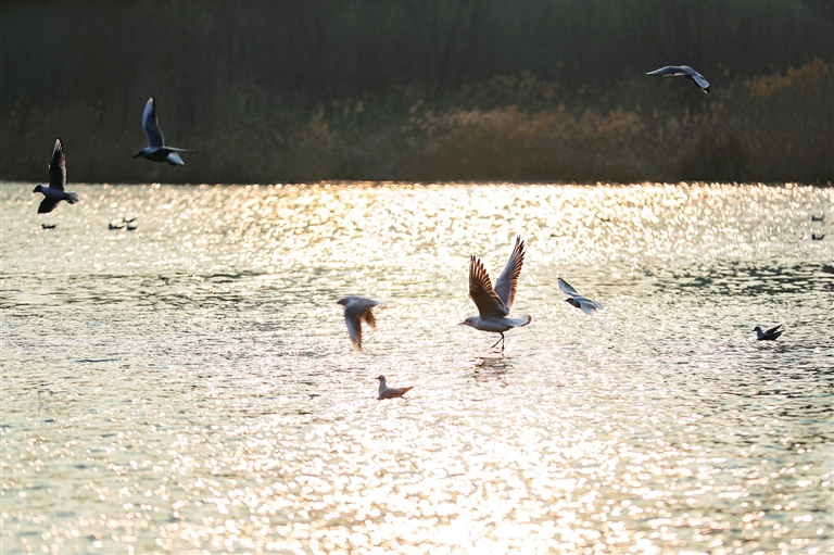 3月25日,汾河景区湿地公园成群的红嘴鸥和棕头鸥在水面嬉戏,吸引游人观赏。