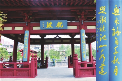 狄仁杰文化公园中间,有一面小湖,湖中清波荡漾,莲叶田田,素洁的荷花在清澈的湖水中亭亭净植,香远益清。造园者取“清如水,明如镜”之意,将其命名为镜池,在镜池南岸与园径之间,又建有水榭一座,命之为清波榭。清波榭和镜池共同寓意了狄公清廉贤明的品质。清波榭前后两面,各有楹联一副。