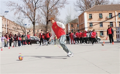3月28日,尖草坪区社区运动会在南寨街道新华西社区举行,来自驻地单位和社区的100余人参加比赛。图为“赶小猪”比赛。 张昊宇 摄