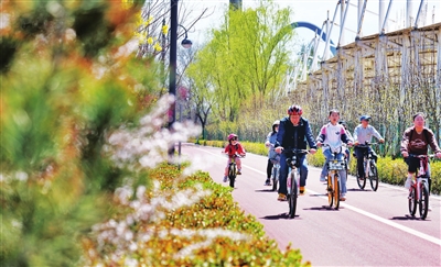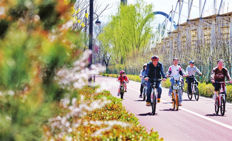 3月30日,市民们骑行于滨河自行车道,享受沿途美好春色。王昕 摄