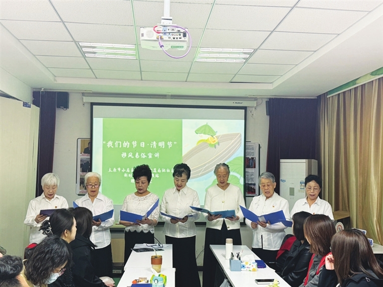 活动开始,社区老年大学朗诵班的学员们为大家深情朗诵《追忆先烈 致敬英雄》,伴随着优美的音乐,朗诵者或慷慨激昂,或低沉婉转,真挚的感情打动了在场的所有人。接着,学员们为居民宣读了文明祭祀倡议书,倡导居民弃旧俗、尚美德、树新风,做文明祭扫的宣传者、推动者和践行者。活动中,首次亮相的朗诵班吸引了大家关注,社区朗诵班组建一年来,已在南环社区小有名气,多次参加社区组织的文艺活动,受到观众们的欢迎。