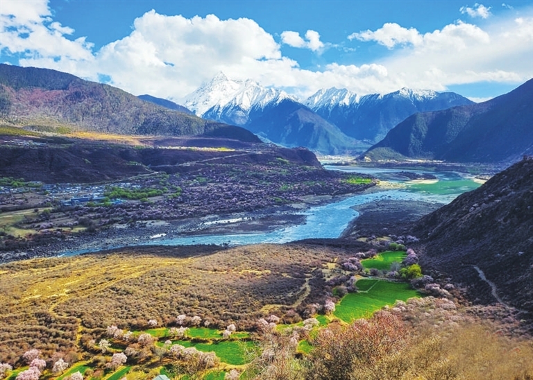 4月2日,西藏林芝市米林市境内的南迦巴瓦峰下,桃花盛开,吸引了众多游客前来游玩。南迦巴瓦峰被誉为“众山之父”,海拔7782米,其山顶终年积雪,而山脚下则是郁郁葱葱的树木和盛开的桃花,形成了一幅独特的垂直自然景观。