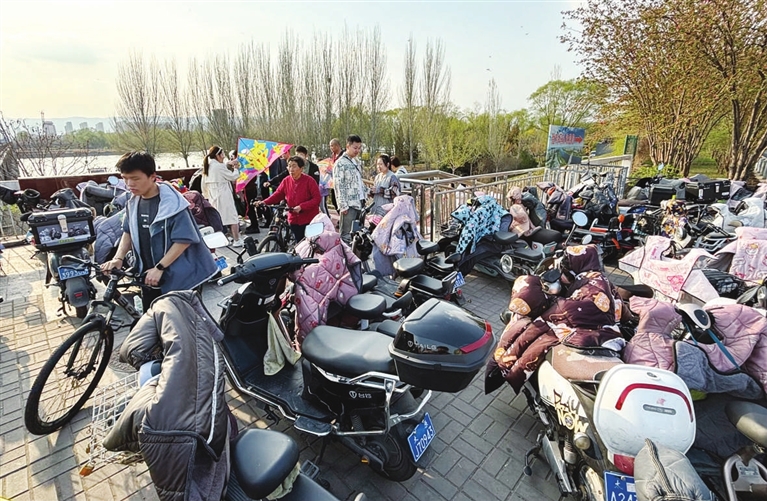 4月6日,汾河景区胜利桥东入口处,大量自行车、电动自行车无序停放,影响市民正常通行。
