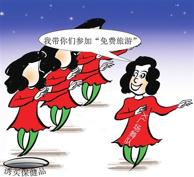 最近市民周先生到母亲家探望时发现,母亲家的杂物房堆满了保健品,包括羊奶粉、壮骨粉、强筋健骨粉、灵芝孢子粉等。原来,这些保健品都是过去一年多母亲在小区广场舞队牵头组织的“免费旅游”活动中购买的。 (《广州日报》4月7日)