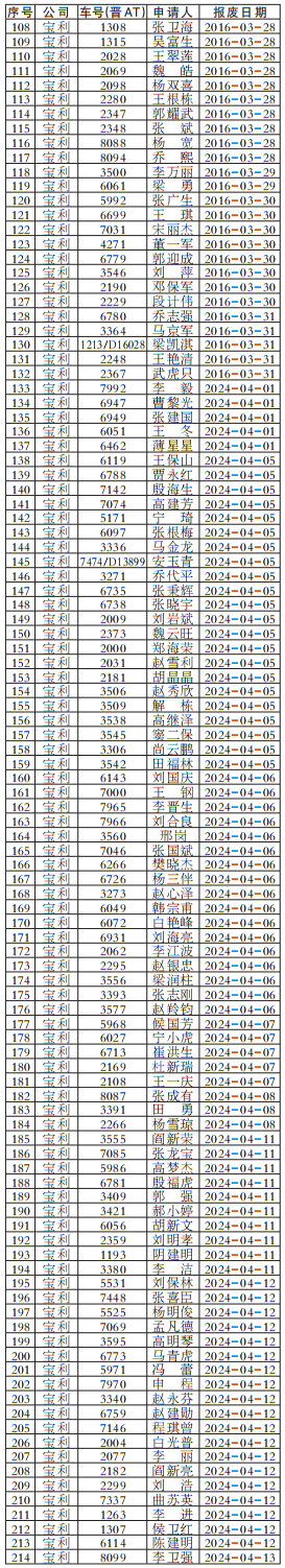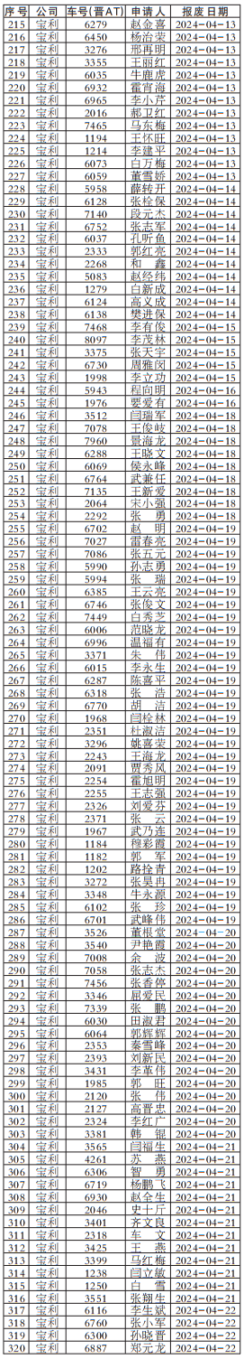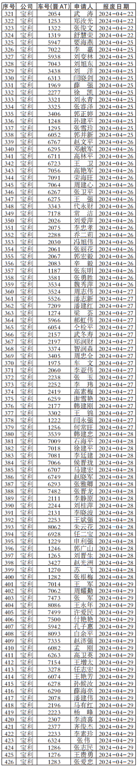 按照《太原市客运出租汽车服务管理条例》等有关规定,我公司对提出车辆更新申请的巡游出租汽车经营者申报材料进行了核实,现对符合条件的经营者名单(第一批426人)予以公示,公示期为2024年4月10日-2024年4月14日,公示期间,若巡游出租汽车经营者及社会各界对上述车辆经营者资格有异议,均可来电反映。
