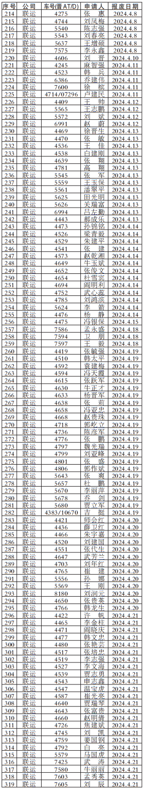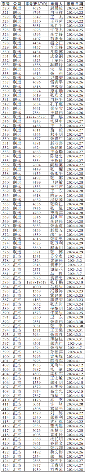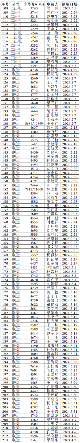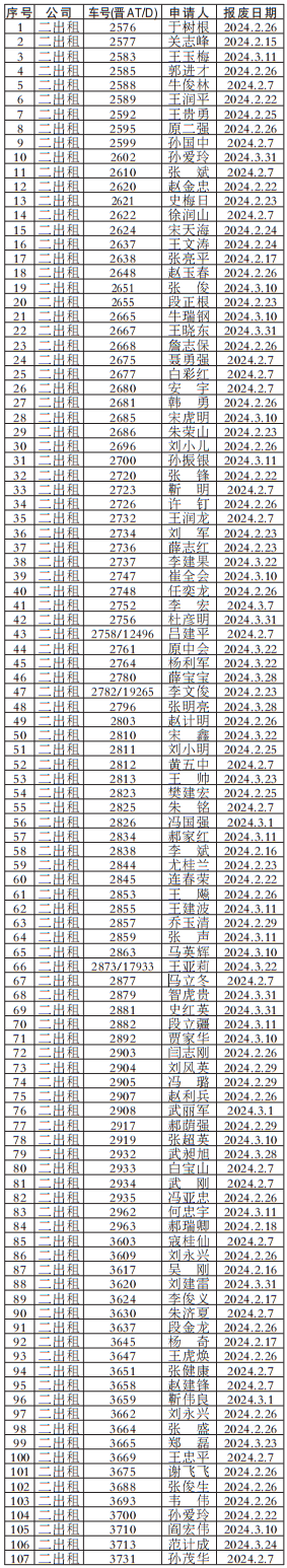 按照《太原市客运出租汽车服务管理条例》等有关规定,我公司对提出车辆更新申请的巡游出租汽车经营者申报材料进行了核实,现对符合条件的经营者名单(第一批426人)予以公示,公示期为2024年4月10日-2024年4月14日,公示期间,若巡游出租汽车经营者及社会各界对上述车辆经营者资格有异议,均可来电反映。