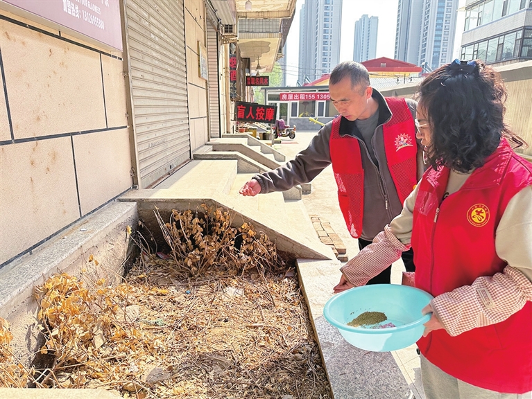 由于缺乏日常养护,社区内很多地方出现黄土裸露、植物枯萎等现象,绿化带内也有较多垃圾。当天,社区组织工作人员先清除杂草、清理堆积物,对空地进行翻土、松土等前期准备,每一道工序大家都认真完成。前期准备工作就绪,网格员将手中的草籽均匀地播撒在松软的泥土上,等待草籽生根发芽。居民们见状纷纷表示,“社区用心绿化美化小区,我们一定会好好维护。”播撒草籽活动,不仅增强了大家的绿化意识,也增强了居民关心和建设美好家园的意识。
