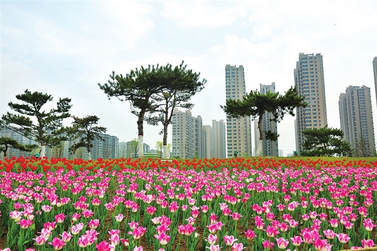 从东四门进入晋阳湖公园,路上皆是兴致勃勃观赏郁金香的游人。远远望去,灿若星河的郁金香色彩艳丽、热烈盛放,组成各式各样的花境、花带、花丛,依公园地势高低起伏,呈现出错落有致的美景。姹紫嫣红、橙黄相间、粉白渐变……如调色板般色彩斑斓,鲜艳夺目。郁金香花瓣形态各异,或含苞待放、或半开半合、或向阳而开。波光粼粼的湖面和随风摇曳的花朵相互映衬,惊艳了这个春日。