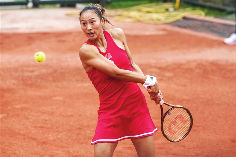 4月10日,在湖南长沙举行的2024比利·简·金杯国际女子网球团体赛亚大区一组比赛中,中国队3比0战胜印度队。图为中国队选手郑钦文在单打比赛中回球。新华社 发