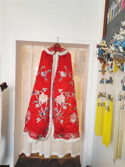“这红色斗篷是戏曲中昭君出塞的‘标配’。这件戏服同样是出自上世纪60年代,因为时间太久了,上面白色的风毛是我收回来后新换的,大红色斗篷配白色风毛,红白对比色彩很是靓丽。”高师说,游客来到这里不仅可以了解戏装文化,更可以扮上自己熟悉的戏曲人物,化个妆拍个照,来一次专业戏曲化妆造型摄影体验,体验戏曲魅力。“身披红色斗篷,怀抱琵琶的王昭君形象大家都很熟悉,这件戏服也成为了很多朋友在这里体验的首选。”