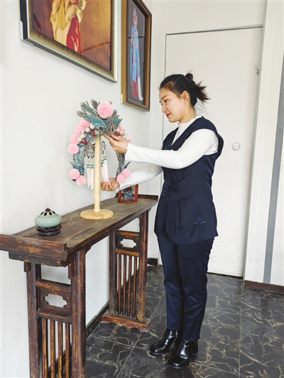博物馆占地面积为260平方米,中间的厅堂内按照八仙桌、太师椅、条案陈设布局,旁边的案桌上陈列着“梅派”凤冠、晋剧《打金枝》中的女过桥。“‘过桥’其实指的就是演员头上的头戴。”高师边拿起“过桥”边介绍,“原来老手艺人用的是点翠工艺,那是用翠鸟的蓝色羽毛镶嵌在头戴上。现在这样的工艺已经变成了‘点绸’,虽然‘点绸’不如点翠矜贵,但制作工艺却依然繁复。师傅们都是用镊子轻轻夹起一片蓝色绸子,背面点上胶水,仔细地粘在底座上。”