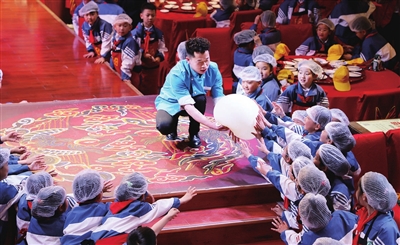 4月12日,迎泽区松侨小学的学生们走进山西面食博物馆开展研学活动,体验山西面食文化的独特魅力。图为吹面气球表演者与学生互动。 张昊宇 摄