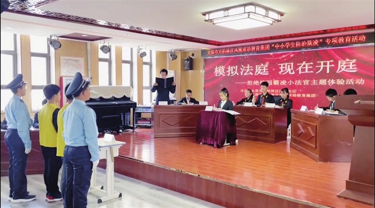 为加强青少年法治教育,4月12日,滨体社区联合凤凰双语小学,开办了一堂别开生面的法治教育课。随着法槌敲响,正式“开庭”。审判长、审判员、公诉人、辩护人、书记员、被告人、法警等角色,均由小学生所扮演。