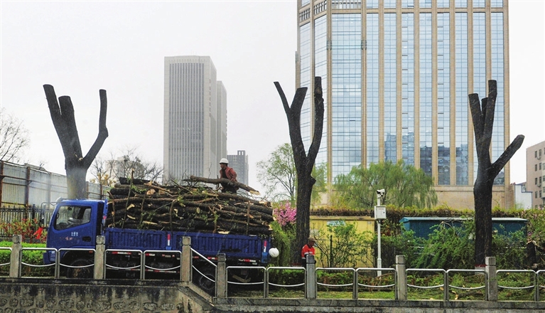 近日,园林部门组织人员在西海子公园修剪树枝,促进树木生长,保护游人安全。 张澍宏 摄