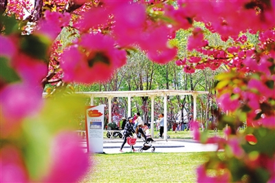 4月13日,迎泽西大街的街心公园内,怒放的晚樱吸引了众多观赏打卡者,街心公园也成为周边居民家门口的樱花园。