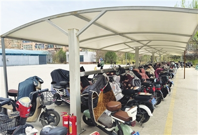 骑行回来,径直停车入棚,扫码充电。一系列操作,家住望景苑小区5号楼的杨女士早已轻车熟路。1元钱可充电4个小时,价格实惠。