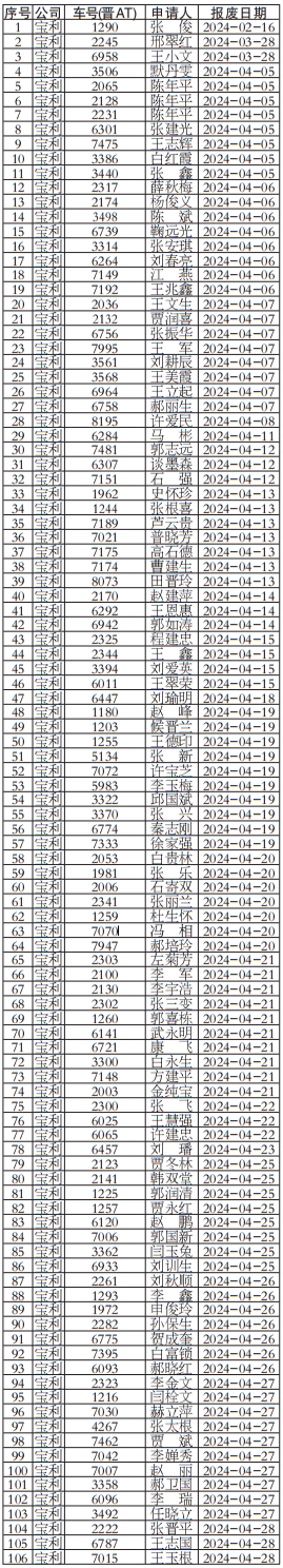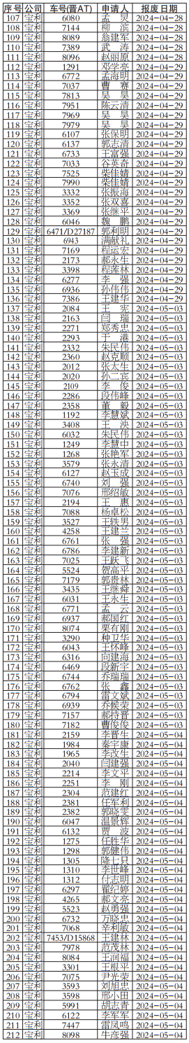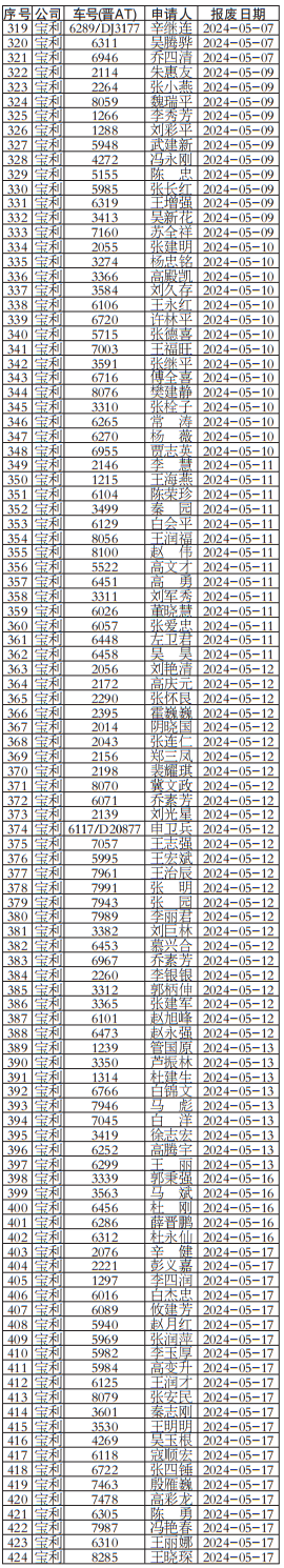 按照《太原市客运出租汽车服务管理条例》等有关规定,我公司对提出车辆更新申请的巡游出租汽车经营者申报材料进行了核实,现对符合条件的经营者名单(第二批424人)予以公示,公示期为2024年4月16日-2024年4月20日,公示期间,若巡游出租汽车经营者及社会各界对上述车辆经营者资格有异议,均可来电反映。