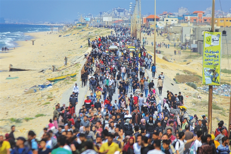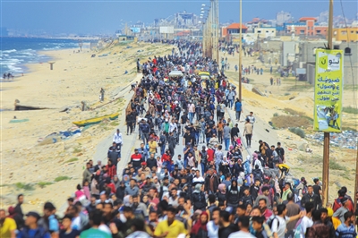 这是4月14日在加沙地带中部拍摄的向北返家的人群。新华社 发