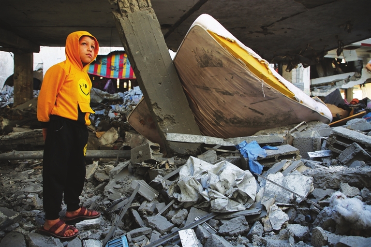 4月17日,在加沙南部城市拉法,男孩站在遭以军空袭的住宅废墟上。据巴勒斯坦电视台17日报道,以军当天空袭加沙地带北部和南部多个地区,造成至少20人死亡。 新华社 发