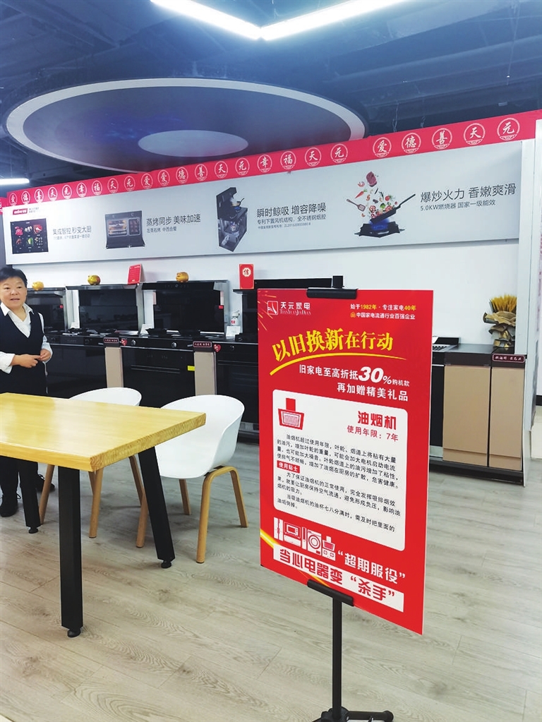 随着众多商企加入,各大卖场“以旧换新”活动接二连三落地。“旧家电至高折抵30%购机款,再加赠精美礼品”“‘以旧换新’至高补贴400元”……4月18日,记者走进居然之家、苏宁易购、天元家电等家电卖场,随处可见这样的宣传海报。