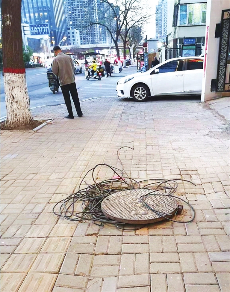 拍摄经过:4月18日,我途经平阳路与文华街交叉口东南角便道时看到,便道上一口通信井的井盖虚掩着,里面杂乱的线缆“爬”了出来,不但影响通行,还有碍市容市貌,希望相关部门尽快处理。