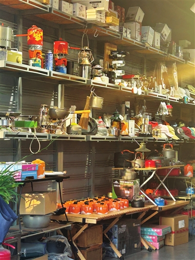 “轻便露营”的兴起对户外装备销售也产生了一定影响。在位于解放路的一家户外装备专营店,记者看到,快开式帐篷、可躺可坐的充气沙发、轻便的折叠式露营桌椅、便捷式煮炉茶壶等户外装备均展示在醒目位置。