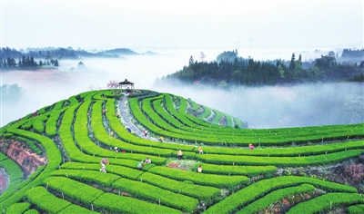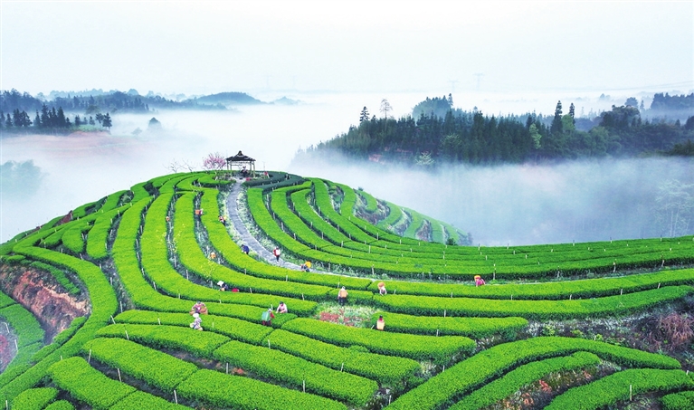 四川省泸州市纳溪区大渡口镇凤凰湖村拂羽茶园,村民忙着采摘春茶。