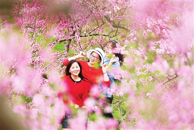 游人在贵州省黔东南苗族侗族自治州凯里市的桃林里游玩赏花。