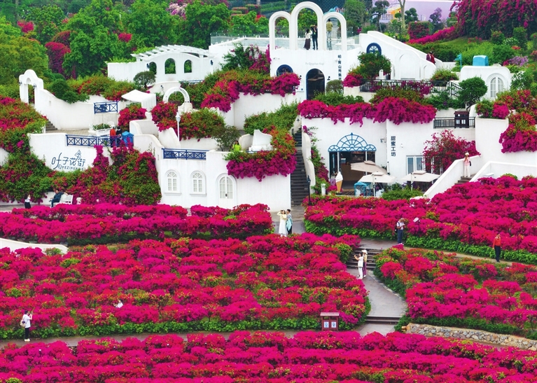 4月10日,游客在广西南宁青秀山景区内的叶子花园观光游览。