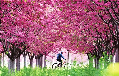 4月8日,游客在河北省邯郸市峰峰矿区义井镇万亩秀林中盛开的海棠花间骑行。
