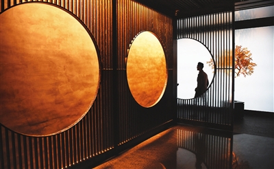 圆形拱门、木色飞檐、湖蓝色天花板……香港故宫文博馆的“下江南”中餐厅,处处充满了江南园林的写意。“装修设计本身讲的就是康熙皇帝下江南的故事,康熙皇帝在杭州题了很多诗,其中就有平湖秋月,所以店面包括餐单设计都是以西湖和月亮为元素,让顾客一进门就进入下江南的故事氛围里。”吴振宇说。