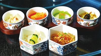 餐桌上,六个古色古香的定制瓷碗里分别盛有黄瓜丝、绿豆芽等六道小菜,色泽鲜亮,摆盘精致,令人食指大动。