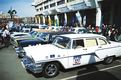 4月21日,人们在俄罗斯莫斯科参加老爷车集会活动。 新华社 发