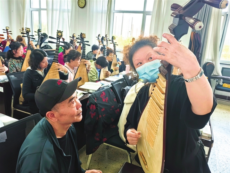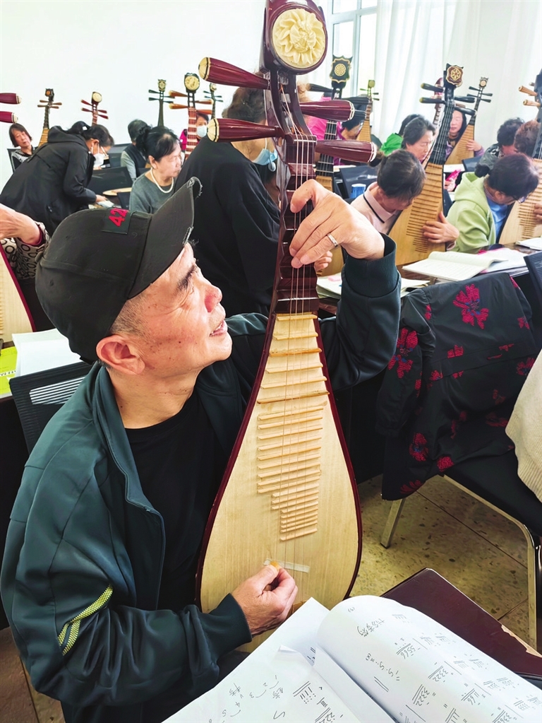 进入教室,靠墙第一排坐着一位男学员,仿佛“百花丛中一点绿”,格外抢眼,他就是市老年大学琵琶班惟一的男学员,67岁的张正宏说起学弹琵琶,直言是被国风古韵的民乐“圈粉儿”,成为琵琶的热衷爱好者。那一次偶然看到《国乐大典》这档电视节目时,被强烈震撼——舞美设计大气恢弘,各种古典乐器演奏的乐曲荡涤人心,让人心潮澎湃,那是一份专属国乐的力量,自此他被国乐之美深深折服。节目中,各种乐器领域顶尖级大师的倾情演绎让他如痴如醉。