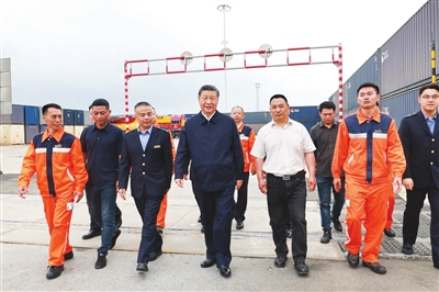 随后,习近平来到重庆铁路集装箱中心站,听取货物集散、运输路径、运营成本和效益等介绍,同货车司机、列车司机、装卸工人、场站管理人员等亲切交流,询问他们的工作强度、劳动保护、节假日休息和收入情况。习近平说,大家在物流一线,也是在对外开放一线,通过你们的辛勤劳动,很多商品跨越山海、走向世界,你们的工作很有意义。推动西部大开放、促进西部大开发,物流很重要,大家要继续努力,不断创造新的业绩,作出新的贡献。