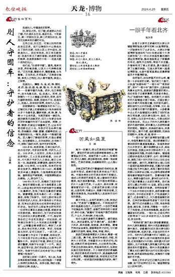 “一眼千年”展厅是博物馆的重头部分,徐显秀墓就在这里。透过玻璃墙可以看到深深的墓道直通墓室。徐显秀被封为北齐武安王,墓中陪葬物品众多,虽经五次被盗,发掘出来的文物依然不少,而且壁画保存完整,所绘极尽奢华。壁画通过描绘徐显秀夫妇宴饮、出行、信仰等画面,展现了那个时代历史文化以及社会生活的缩影。展厅内,原墓的封土堆以及那个显眼的盗洞被原样保留,而墓内的实景则通过电子声光展示,再现了墓的发现和发掘以及保护全过程,也让参观者能更清楚地看到壁画所绘细节。身着华服的墓主人,弹奏乐器的乐队,豪华的出行牛车,无不显示着墓主人生前的尊贵。我们甚至可以戴上先进的VR设备,更加立体地看到墓室内真实的场景。我特别留意了一下乐队中的那位吹笛手,虽然做着吹笛的动作,手中却没有笛子,不知是画家大意了,还是有意为之,只为营造幽默的效果。这样的缺憾给参观者留下无尽的遐想。展厅内还点缀着出土文物,有各种造型俑,骑马俑、文吏俑、风帽俑……当然少不了鸡首壶,还有各种釉陶碗,甚至还有镶蓝宝石的戒指。一眼千年,这些无声的文物带来了1400多年前的古人生活痕迹,弥足珍贵。