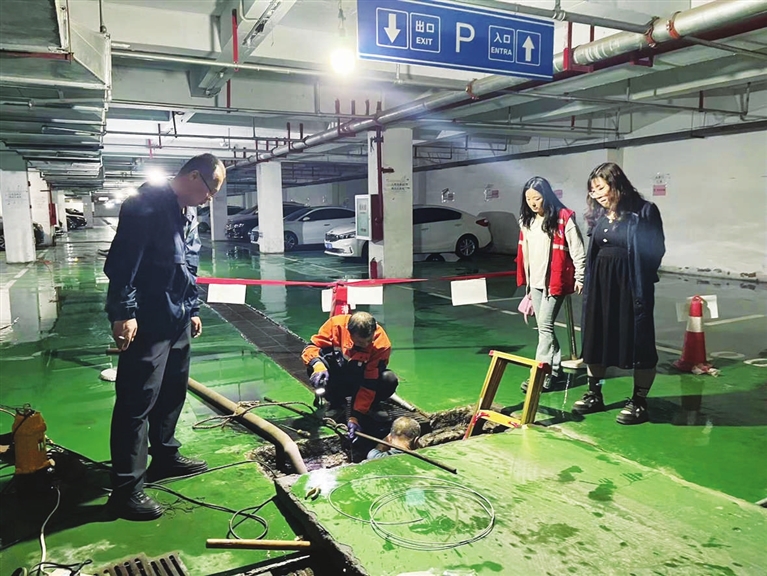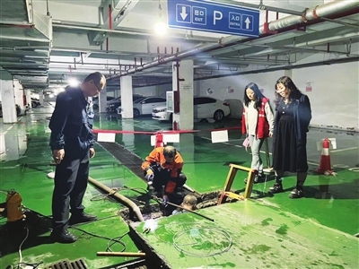 家住香悦澜溪小区的朱女士,将车停入地库,下车却踩了一脚水。她向社区网格员郭俐君反映,说地库漏水。长风街北社区协调物业,在地库全面排查,却找不到漏水点。并且,漏水情况确实存在,地上总有积水。随即,物业请来供水部门的工作人员,采用专业仪器对水样进行鉴定。结果显示,地上的积水并非自来水,由此断定,供水管道没问题。随即,大家留意到一个细节,积水摸上去温乎乎的。由此,物业负责人想到,据此处约10米是一处工地,里面有口温泉井,可能与它有关。