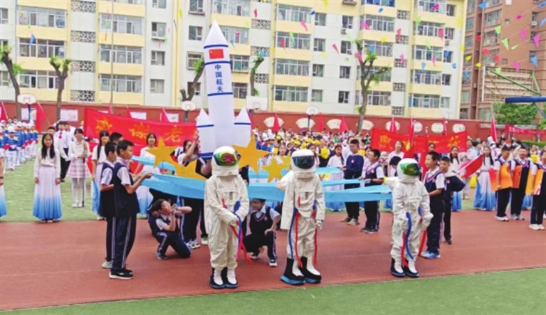 开幕式上,以“科技点亮未来”为核心要素,各年级师生用探究性学习成果汇报的方式,为大家带来一场科技感十足的入场式表演,充分展现了文新小学师生的创新思维和蓬勃朝气。身穿太空服,手持巨型充气火箭,一年级学生为我国航天事业取得的一次次突破喝彩,二年级学生扮演的人工智能机器人在舞蹈中“链接”未来。最有特色的是四年级学生表现的“中国速度”,从人们记忆中最主要的交通工具自行车,到绿皮火车成为人们出行首选交通工具,再到中国开通首条高铁……孩子们用情景再现的独特方式,演绎了时代变迁,见证了中国交通事业的发展和中国工程技术界的光荣。
