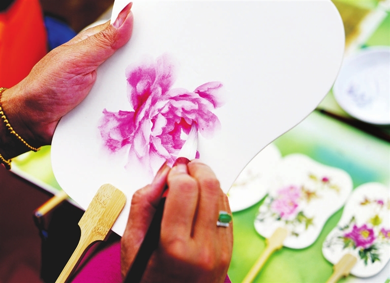4月17日,在河南省洛阳市隋唐城遗址植物园,工作人员在绘制牡丹主题工艺扇子。