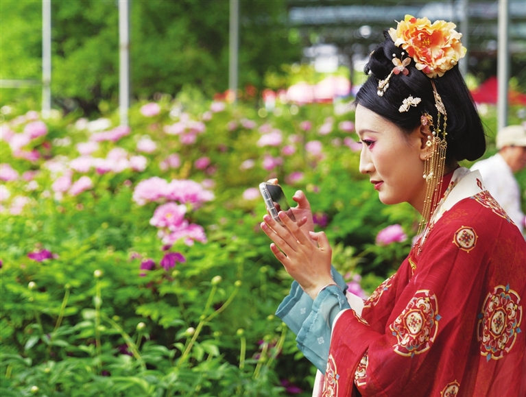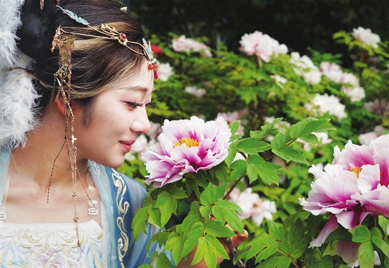 4月16日,身着传统服饰的游客在河南省洛阳市中国国花园赏花拍照。