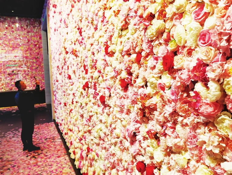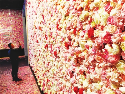 4月16日,游客在洛阳牡丹博物馆拍摄“牡丹花墙”。