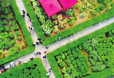 4月17日,游客在河南省洛阳市隋唐城遗址植物园赏花(无人机照片)。