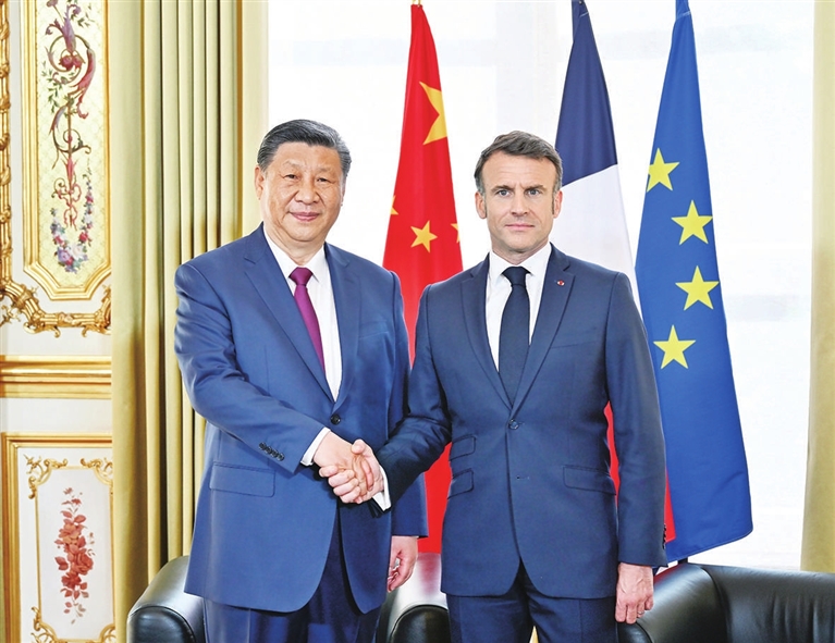 马克龙表示,今年法中将共同隆重庆祝法中建交60周年。法中关系友好,合作富有成效,不仅涉及高尖端技术,也包括气候变化、海洋多样性等全球性议题。习近平主席访问期间,双方签署多项合作协议,再次彰显法中合作的潜力和前景。当前,世界面临诸多紧迫挑战,法中关系处于承前启后的关键时刻。法中关系具有深厚底蕴,双方相互尊重,着眼长远,加强合作,将为解决全球性挑战、避免集团对立对抗发挥重要积极作用。法方希望同中方进一步密切双边经济关系和多边沟通协作,推动法中战略伙伴关系取得更多成果。法方希望向中国出口更多农产品,同时将对中国保持市场开放,不会针对中国企业搞歧视性政策,欢迎更多中国企业包括高技术企业赴法投资合作。法方愿同中方加强航天航空、民用核能等领域合作,共同办好今年法中文化旅游年活动,欢迎中方派团出席巴黎奥运会。法方愿就气候变化、生物多样性保护、人工智能等全球性问题同中方密切沟通合作,共同维护多边主义、联合国宪章宗旨和国际法。