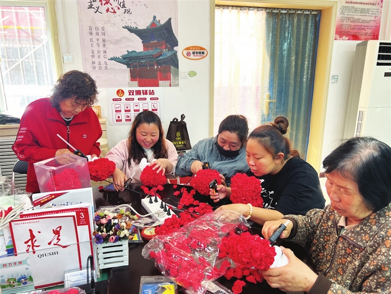 志愿者指导老人制作花卉摆件。