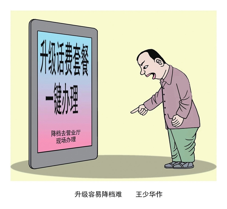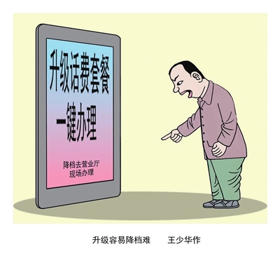 “只有升级话费套餐选项,找不到降级选项”“降档就得去营业厅现场办理”……据媒体调查,手机话费套餐大有玄机,概括而言就是“升级容易降档难”。(《北京日报》5月8日)