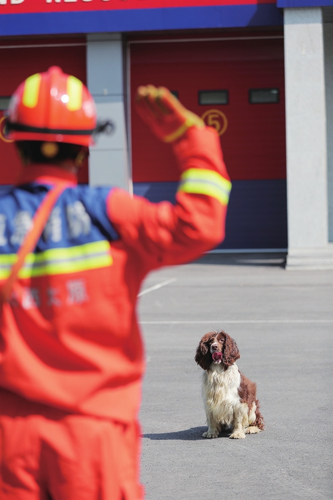 5月9日,太原市消防救援支队重型机械大队训导员正在对消防搜救犬进行训练,以提升消防搜救犬在夏季灭火救援工作中的战斗力。 王韵菲 摄