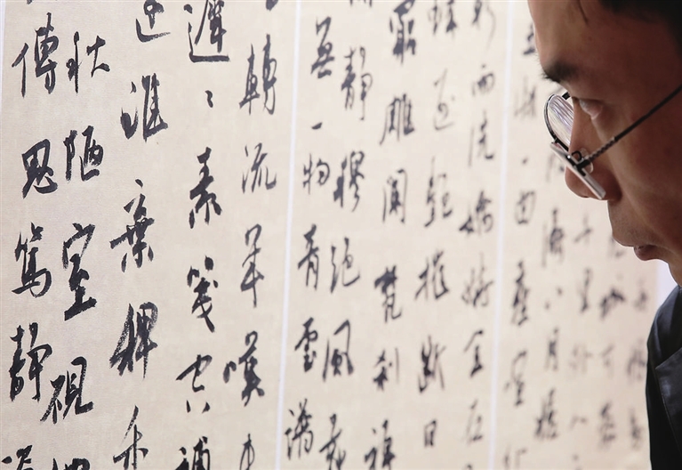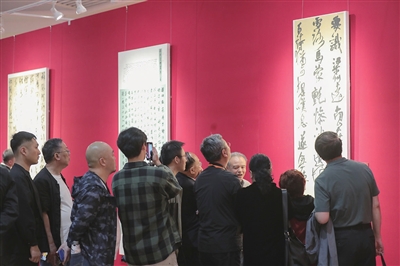 在山西省展览馆内,“行书、草书作品展”规模浩大,数百幅优秀书法作品悬挂在红墙上,与络绎不绝的观众不断产生共鸣。走在展厅里,不时见到颇有名气的书法家、书法爱好者们互相交流研讨,还有大学的书法系老师带着各自的学生欣赏学习……