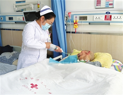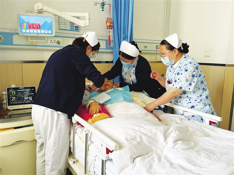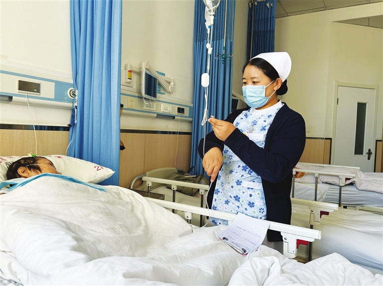 “叮咚,19床呼叫。”护理站的呼叫器响起。“您好,马上过去。”挂断电话的郭丽霞,起身推着治疗车走进病房,快速为患者更换液体,又盯着监护仪显示屏上的数字说:“爷爷,今天状态不错。”
