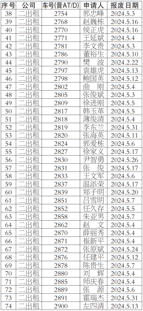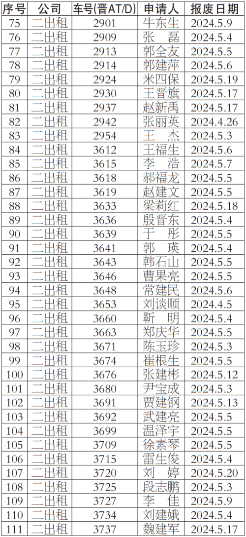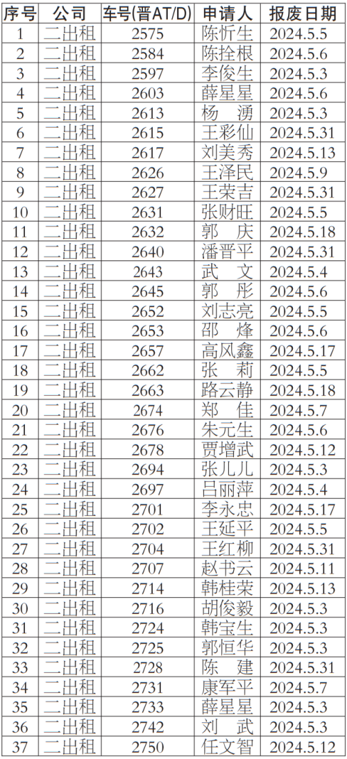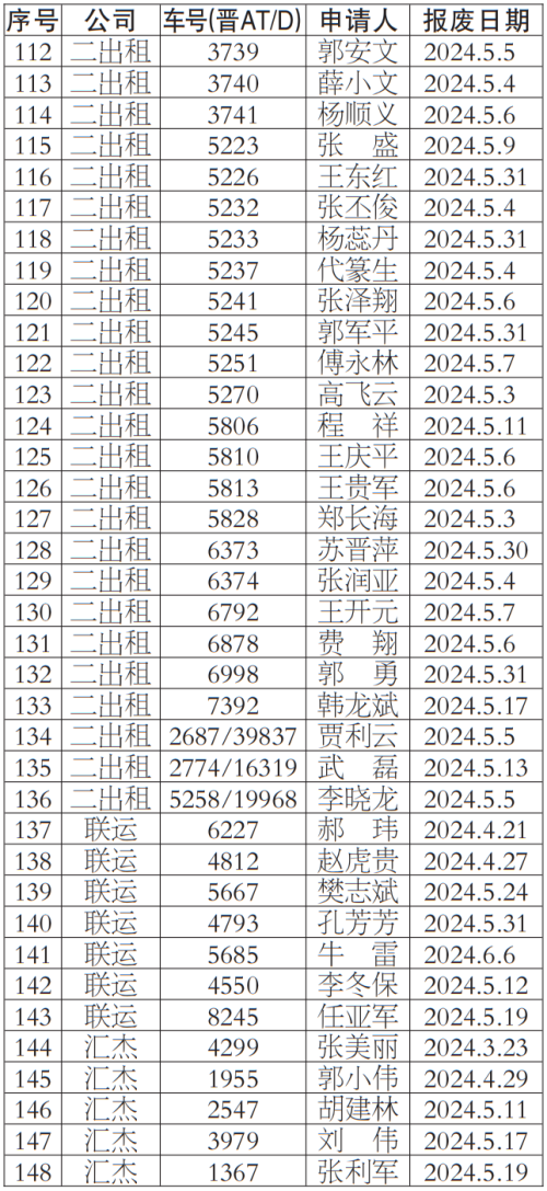 按照《太原市客运出租汽车服务管理条例》等有关规定,我公司对提出车辆更新申请的巡游出租汽车经营者申报材料进行了核实,现对符合条件的经营者名单148人予以公示,公示期为2024年5月14日-2024年5月18日,公示期间,若巡游出租汽车经营者及社会各界对上述车辆经营者资格有异议,均可来电反映。