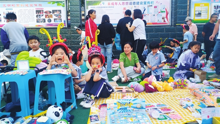 在欢快的气氛中,交易会正式开市。活动现场,琳琅满目的商品、风格各异的摊位、形形色色的创意海报,让人眼花缭乱,目不暇接。摊位上,摆满了孩子们自己制作的手工艺品、各种课外书、可爱的玩偶,还有的小“老板”现场制作美味的水果捞、冰粉、糖人等,吸引了不少大朋友、小朋友驻足购买。孩子们是“老板”也是“顾客”,看到心仪的商品,一番讨价还价后,掏出小钱包,买下自己心爱的物品,喜悦之情溢于言表。